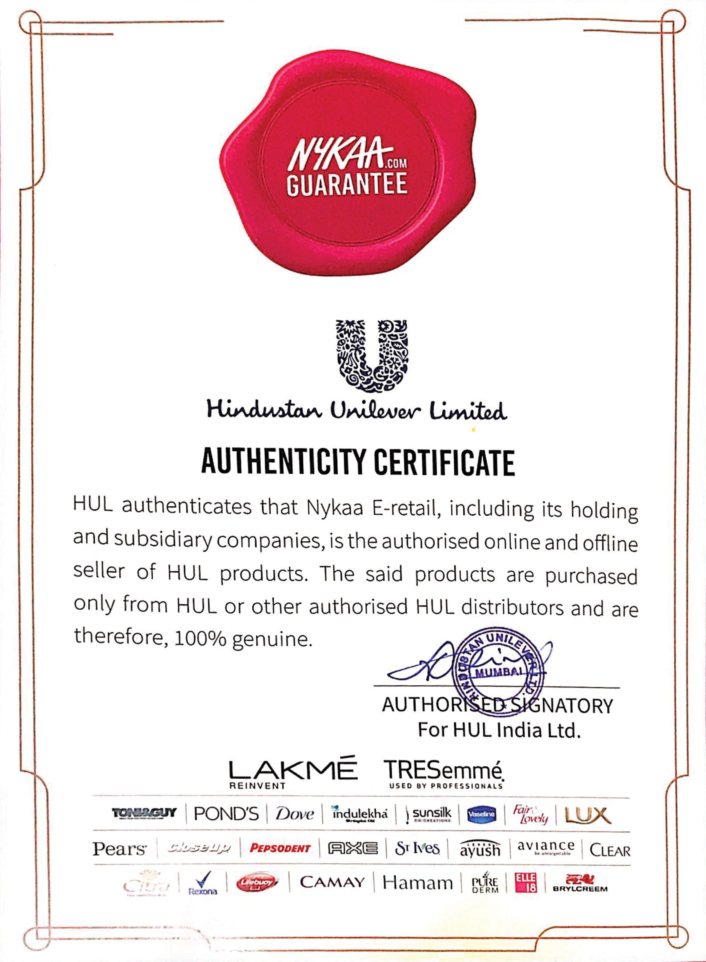 Nykaa's seal of authenticity is our guarantee that the products sold on the site are 100% Authentic and only sourced directly from brands or their authorized distributors.