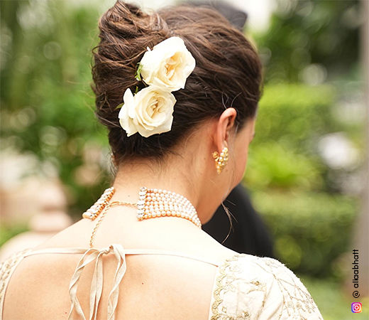 It’s Alia Bhatt’s world and we are living in it. The multi-hyphenate, while accepting her National Award for the best actress, donned a French bun. The cherry on the top? The white roses – add a retro twist to the elegant look. If you wish to recreate this hairstyle as a Navratri hairstyle – start by puffing up your natural tresses for volume on the crown. Now, tie your natural (slightly tousled) locks in a low, loose pony. For the grand finale, twist and pin this pony into a bun. If you can’t find fresh flowers, grab this juda pin from Nykaa for a chic avatar.