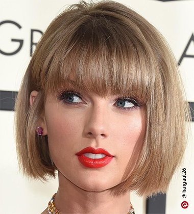 If you’re looking to add an angle to your face, layered bangs will do just the trick. Think of it as an edgy take on the standard style. When styling, backcomb to add a little volume to the crown and to create the illusion of a longer face. Tong the loose hair with a curling iron to lend a softer look while adding bounce to the body.