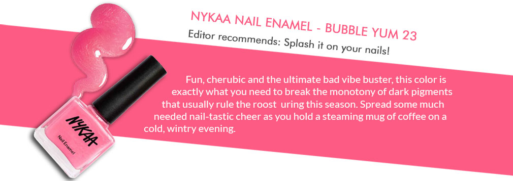 Fun, cherubic and the ultimate bad vibe buster, this color is exactly what you need to break the monotony of dark pigments that usually rule the roost during this season. Spread some much needed nail-tastic cheer as you hold a steaming mug of coffee on a cold, wintry evening.