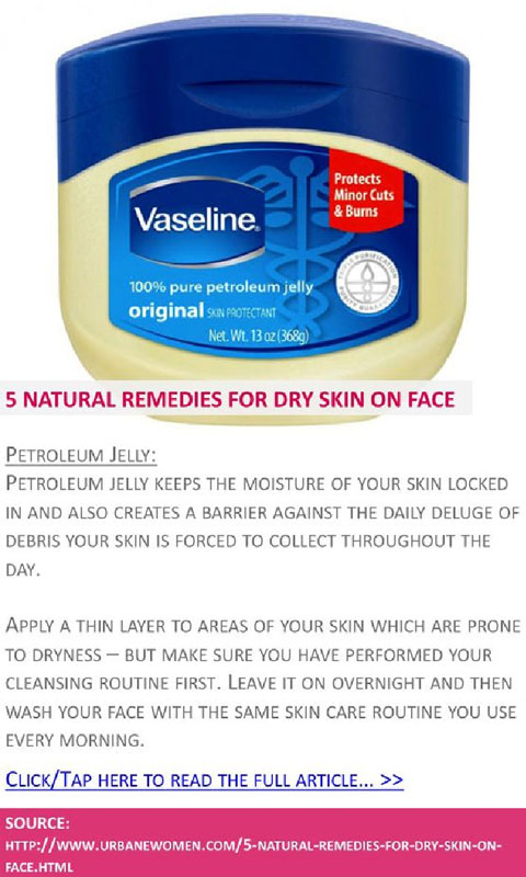 Tips for Healthy Skin: Petroleum jelly on your faceIt's great for healing cracked heals and chapped hands, but on your face? Not so much! While petroleum jelly seals in moisture on super dry, fragile skin, and protects cuts, bug bites, and other wounds from the air, it isn't a long-term fix. Sure your skin will feel softer but the formulation is so thick that it will also trap dirt and debris that cause dryness over time because it keeps air and moisture from touching skin.