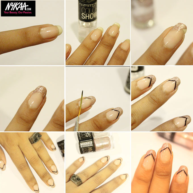 Give the classic French manicure a twist with chevron tips and glitter nail paint. Here’s how to recreate this: