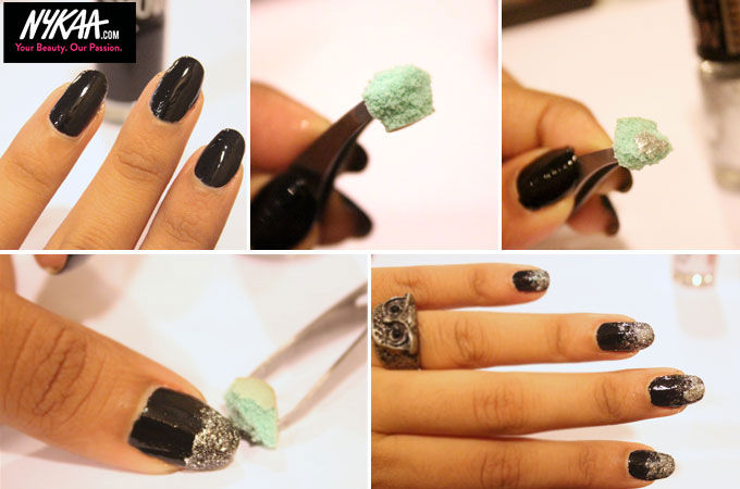 Step 3: Use a pair of tweezers to hold the sponge and dab the glitter polish on gently concentrating more at the tips to create a gradient effect.