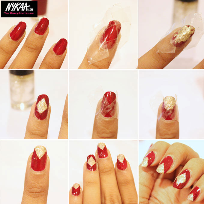 Step 4: For your remaining fingers, apply tape in such a manner that it forms a ‘V’ shape at the tips, apply the glitter polish, and peel it off. Finally, seal everything with a top coat.