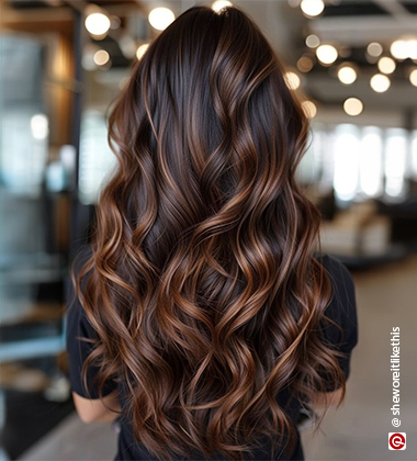 The best way to change your look is to add some highlights to your dark hair. Not only does it create the right amount of depth and contrast, but makes your hair look super voluminous, especially when styled with layers or texture. We love Brown highlights on black hair which complements almost all skin tones and can look oh-so-natural. PS: Scrunch your hair for easy waves to complete your entire look.