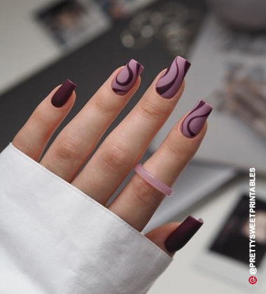 - You can also try an accent nail with design, where one nail has a silver base and wine-coloured lines.