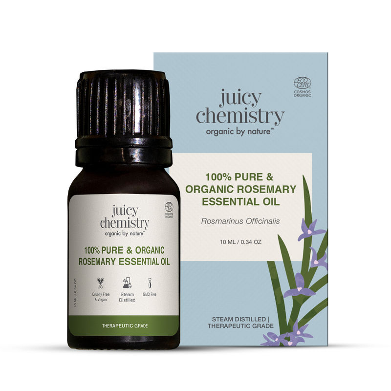 Rosemary oil can help to condition the hair, leaving it soft, smooth, and shiny. It can also help to tame frizz and add volume to the hair.Juicy Chemistry's Rosemary oil is certified by the COSMOS organic standard, ensuring that it is free from harmful pesticides and other chemicals. This makes it a safe and natural choice for promoting hair growth and scalp health.This oil is steam distilled, a process that helps to retain its natural aroma and therapeutic properties. It is of premium quality and is graded as therapeutic, ensuring that it is effective and safe for use.Regular use of Rosemary oil can help to stimulate hair growth and reduce hair fall. It improves blood circulation in the scalp, which helps to nourish the hair follicles and promote healthy hair growth.Rosemary oil has antimicrobial properties that can help to keep the scalp clean and free from dandruff and other scalp issues. It also helps to soothe an itchy scalp and reduce inflammation.Rosemary oil can help to condition the hair, leaving it soft, smooth, and shiny. It can also help to tame frizz and add volume to the hair.