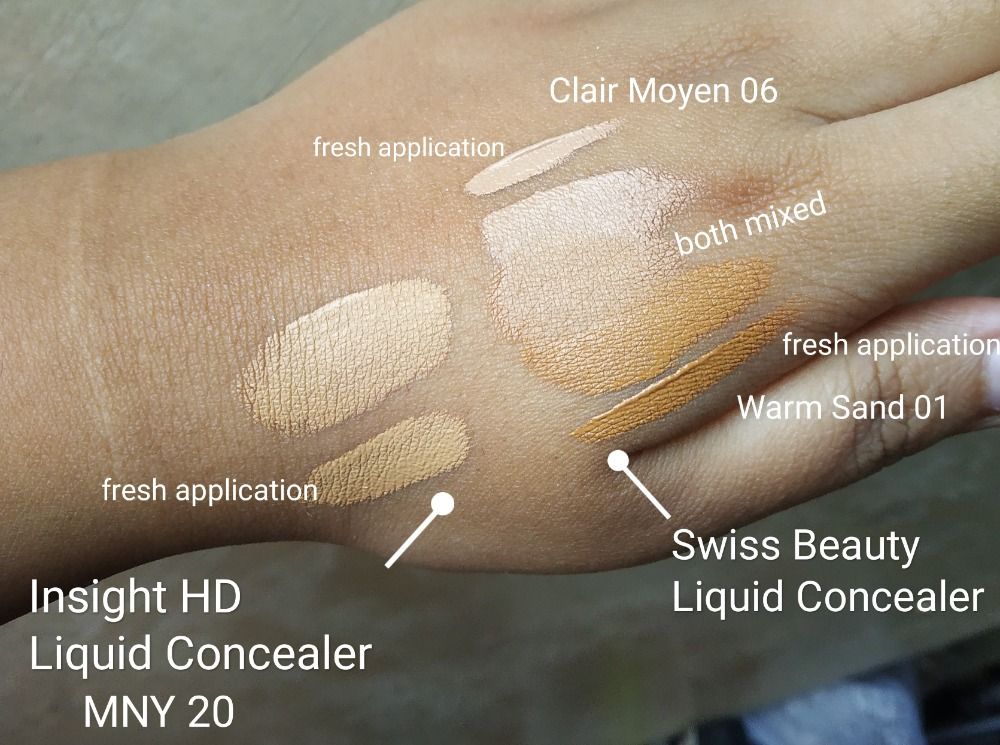 My shade reference : Maybelline - Fit me [ Golden Caramel 332], Superstay [ Golden Sun 312] This concealer has a shade very similar to that of Maybelline Superstay foundation shade Golden Sun 312. (See pic for reference) I have swatched Swiss beauty concealers next to it for an idea of where it lies in the shade range. It oxidizes quites quickly so that is one thing to be careful about. After blending it with a concealer brush the coverage was quite full coverage with a little pigmentation peeking through ( without any colour corrector). Dry skin people might want to avoid this as this has quite a matte finish. They might want to start with a good moisturizing skin prep to use this. It sets by itself quick and for setting the concealer some might want just a little powder. The applicator is huge doe foot like the elf camo concealer one. Pros: ~ Full Coverage ~ pocket friendly price ~ self setting ( pro for oily skin type, for dry skin people it might not be the go to product) Cons: ~ limited shade range ~ settles very quick so have to blend quickly ~ turns orange after oxidisation for some reason