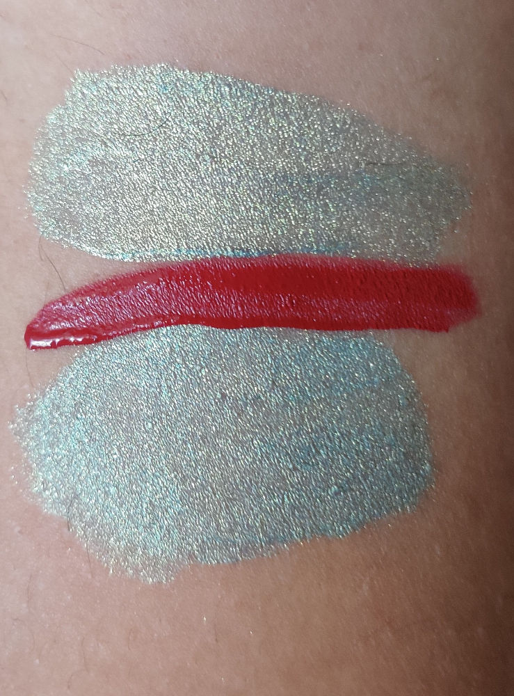 Beautiful gold and blue metallic eyeshadow. Thank you for the free inside liquid lip shade.