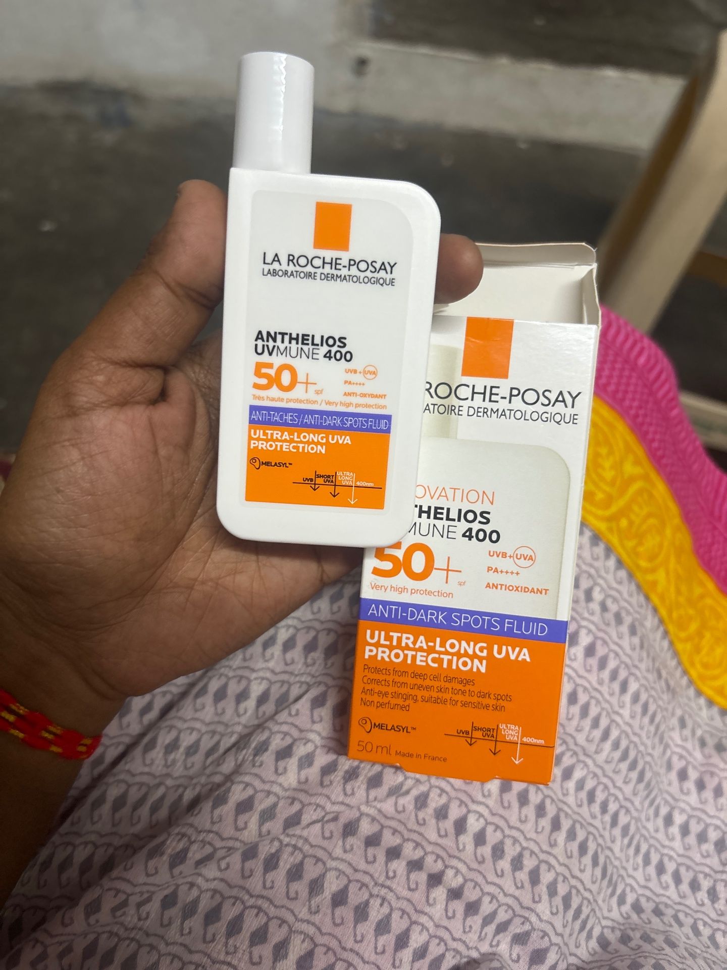 Fluid sunscreen that gets applied easily and I'd lightweight. It has spf 50+ and improves the skin texture by reducing dark spots. It does not leave white cast and is non greasy.