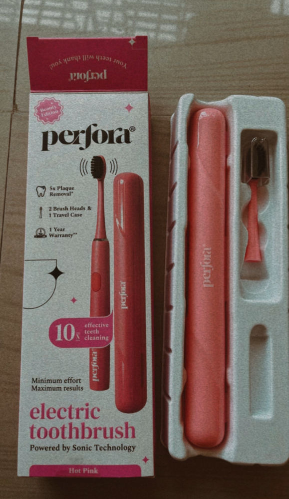 Perfora electric toothbrush in a cute hot pink edition is so pretty and convent to use Comes with extra head and case to cover it from germs and scratches